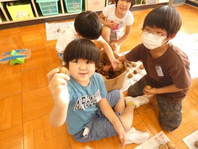 畑で育てたジャガイモを7月20日に販売する活動をしています。学級に行ってみると、大きさの違うジャガイモをサイズごとに分けていました。これから袋詰めをする予定です。