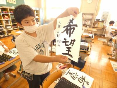 3連休も終わって学級ではどんな様子か見に行くと、6年生が書写をしていました。姿勢を良くして、付けや止めに気を付けながら丁寧に書いていました。「希望」という字をのびのび書いていました。