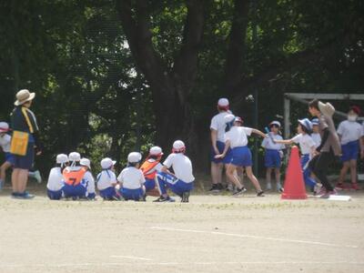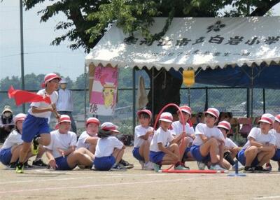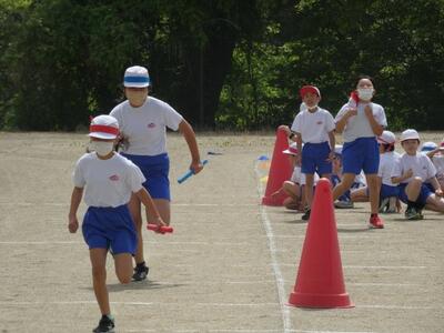1時間目のリレーの練習は、まずは理解するところから始まります。低学年は、どこで誰からバトンをもらって誰に渡すのか、意外に難しいのです。まずは、1回やってみたら、やっぱり盛り上がりますね。