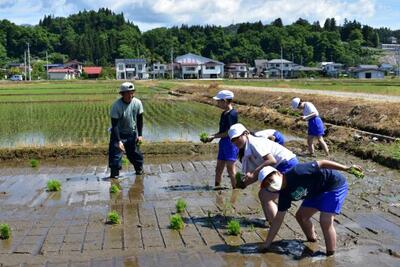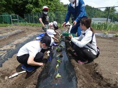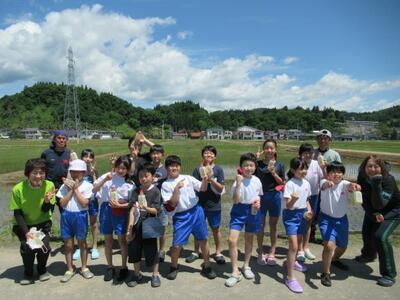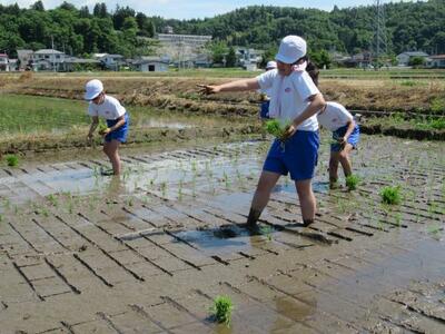 抜けるような青空のもと、地域の方の協力により、5年生が田植え体験を行いました。田んぼの先生やJAの方、保護者の方からもおいでいただききました。子どもたちも、初めての体験に悪戦苦闘しながら、日本の食の原点に触れました。