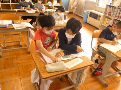 4年生は算数で「256÷4」の筆算の仕方を考えていました。最初に図で問題の意味を考えさせたあと「図で解くのは大変だね」と先生がいうと、「筆算を使うといい」という意見ができてました。ここから教え合ったり、電子黒板を使ったりして学習しました。
