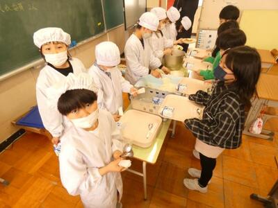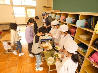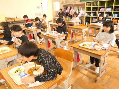 今日から給食が始まりました。新しい学年での初めての給食です。子どもたちはおいしいカレーライスをにこにこしながら食べていました。