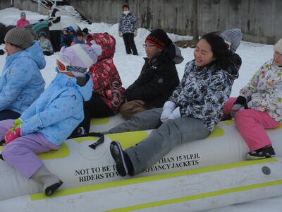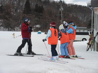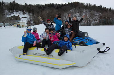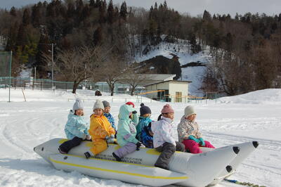 今日は、6年生が天童高原スキー場で”スキー教室”を、1~5年生が学校のグラウンドで”バナナボート体験”を行いました。