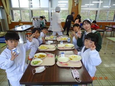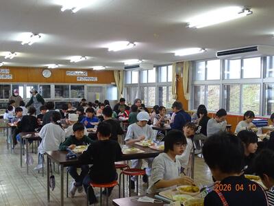 給食が始まりました。食堂で、全校生一緒の給食です。子どもたちは、向かい合って顔を見合わせながら、笑顔で食べています。
